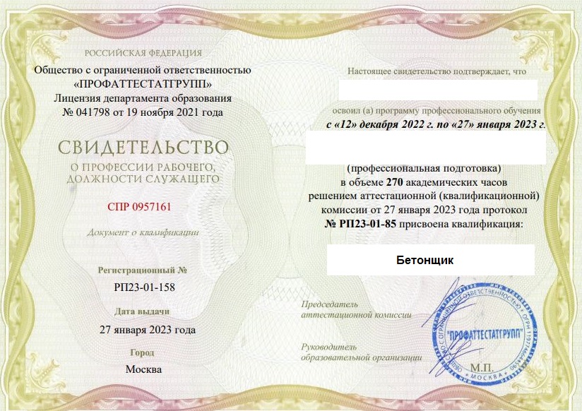 В заключение, бетонщик является ценным членом любой строительной бригады, ответственным за обеспечение прочности и устойчивости бетонных конструкций. При соответствующей подготовке каждый может стать квалифицированным бетонщиком и сыграть решающую роль в строительной отрасли. Купить свидетельство бетонщика можно в нашей компании с онлайн обучением.