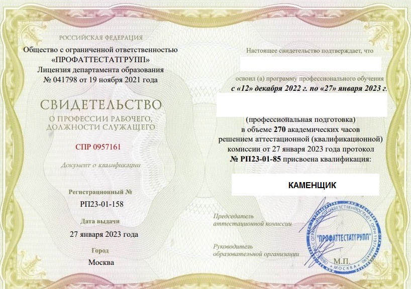 Каменщик — это квалифицированный мастер, который работает с кирпичом, бетоном, камнем и другими материалами для строительства и ремонта стен, фундамента и других конструкций. Каменщики используют различные инструменты и методы для укладки кирпичей и создания растворных швов, и они несут ответственность за то, чтобы их работа соответствовала самым высоким стандартам качества и безопасности. Профессия каменщика имеет долгую историю и имеет важное значение для строительной отрасли. Купить удостоверение каменщика можно сейчас с обучением в нашей онлайн школе.