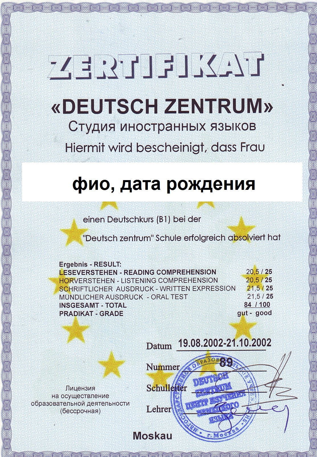 Ниже приведен пример сертификата немецкого языка. Цена такого документа 9000 рублей. Связаться с нами по вопросу приобретения данного документа можно через раздел контакты.