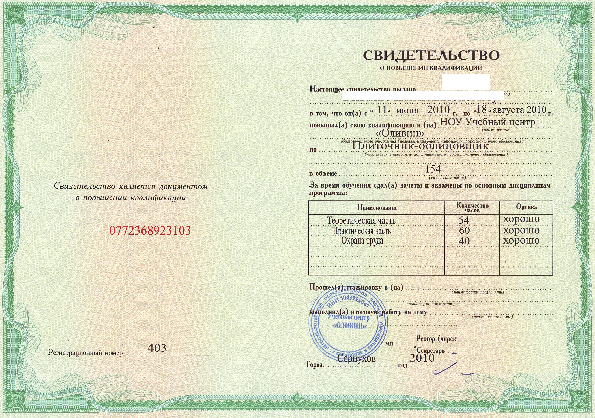 Свидетельство о повышении квалификации.