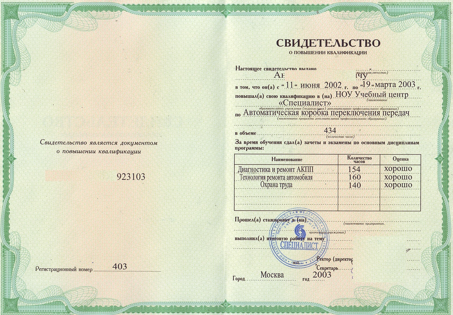 Свидетельство о повышении квалификации представленное на этой странице подходит практически для всех специальностей. Если вы хотите повысить к примеру квалификацию повара, парикмахера, массажиста и других направлений, то по окончанию учебных часов выдается свидетельство о повышении квалификации. В нем будет указано направление, учебный часы и программа обучения, а так же учебный центр, выдающий этот документ. С примером свидетельства о повышении квалификации "Автоматическая коробка переключения передач" вы сможете ознакомиться на этой странице.